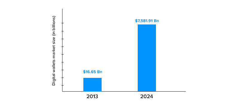 Digital Wallets are effectively on a way to eradicate fiat money from the wallets. In fact, in a report by Grand View Research, it was revealed that the digital wallet market size was valued to be USD 16.65 Bn in 2013 and is predicted to reach USD 7,581.91 Bn by 2024.