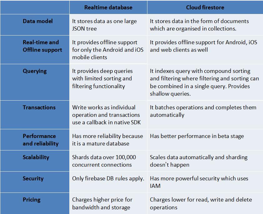 Let us now compare The Realtime database and Cloud Firestore to have a clearer understanding of when to use which. Cloud firestore is still in its beta testing stage and it is looking and working in a more promising way than Realtime database. In this comparison, will see how the two databases differ from each other and who wins the realtime database vs cloud firestore.