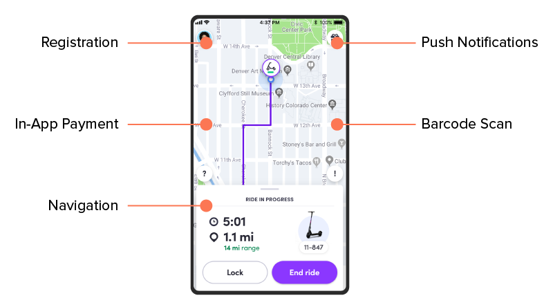 An integral part of Bird eScooter like app development cost is the barcode scanning feature. It is how the riders will start the ride on their eScooter. You should ensure that the process of scanning the barcode off the scooter is seamless (this is one of the biggest challenges of making electric scooter app that developers face).