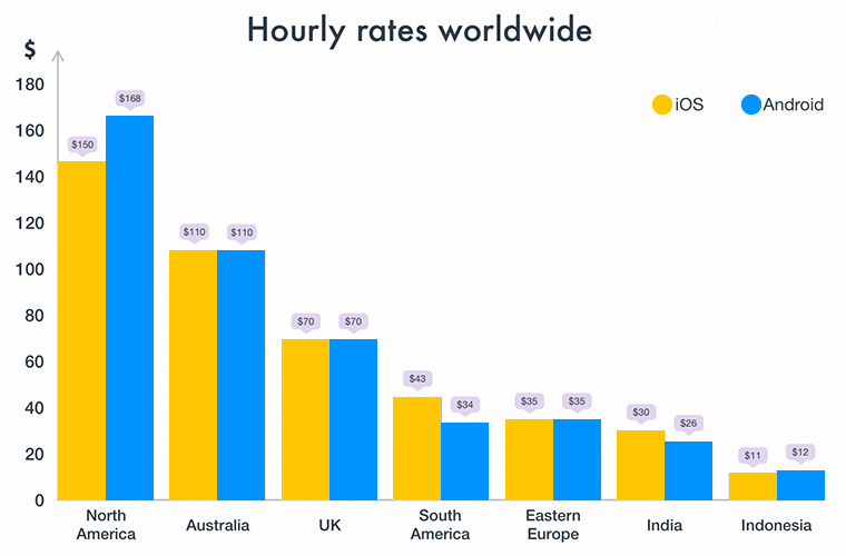 The price of UI and UX designers vary greatly on the basis of the locality they are housed out of. While designers in USA or Australia would charge $120 – $150 per hour, Eastern nation designers would charge around $50 to $80 per hour as their mobile app design price.