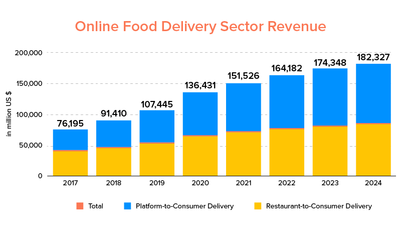 According to a Statista report revenue in the online food delivery segment is projected to reach US$136,431m in 2020. Also, about online food delivery, restaurant-to-consumer is by far the leading global category but platform-to-consumer delivery is growing faster.